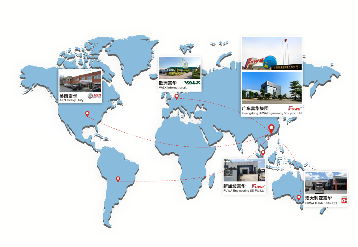 广东富华机械集团创始于一九九七年,是全球领先的商用车(卡车、挂车&工程车)车轴及底盘零部件制造商。现全球同时运作FUWA(中国及亚洲)、VALX(欧洲)、AXN(北美)、K-Hitch(澳洲)四大品牌。总占地面积超过250万平方米,旗下包括14家分公司、5家海外公司、4座大型制造基地、2个集装箱码头。
